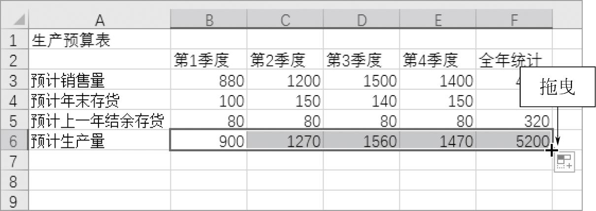 STEP 06 将鼠标指针移至B6单元格的右下角,此时鼠标指针会呈十字形显示,按住鼠标左键并向右拖曳至F6单元格,即可填充公式,计算第2季度~第4季度以及全年的预计生产量,效果如图1-38所示。