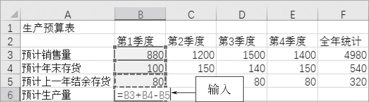STEP 04 选择B6单元格,在其中输入公式:=B3+B4–B5,如图1-36所示。