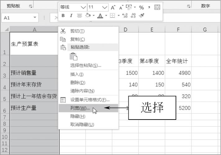 STEP 07 单击鼠标右键,在弹出的快捷菜单中选择“列宽”选项,如图1-45所示。