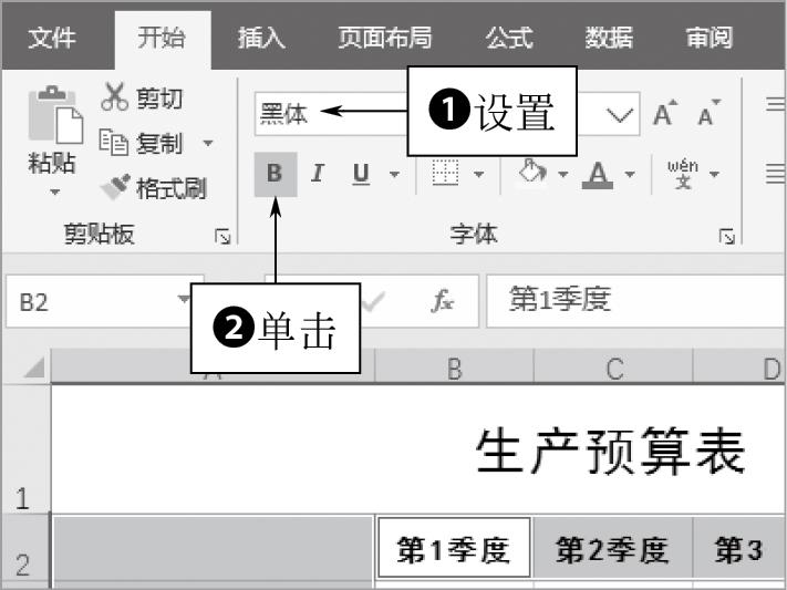 STEP 19 在“开始”功能区的“字体”面板中,❶设置“字体”为“黑体”;❷单击“加粗”按钮 ,如图1-57所示。