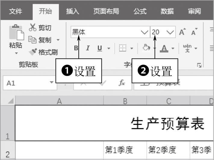 STEP 14 在“开始”功能区的“字体”面板中,❶设置“字体”为“黑体”;❷设置“字号”为“20”,如图1-52所示。