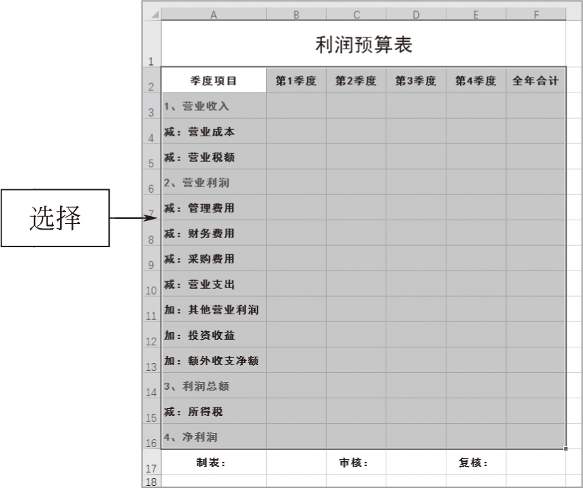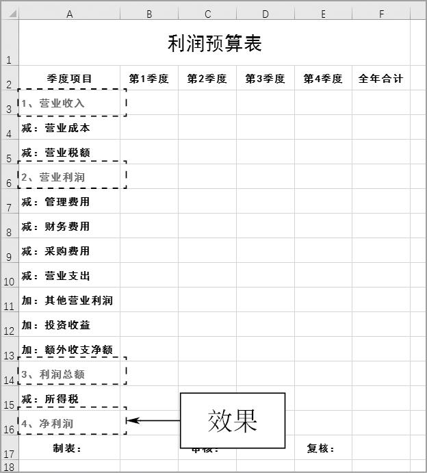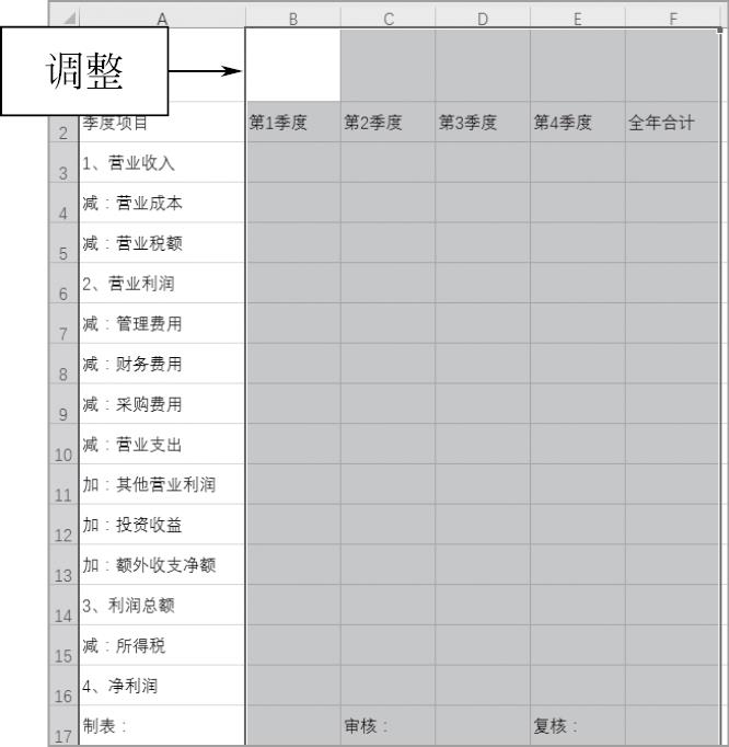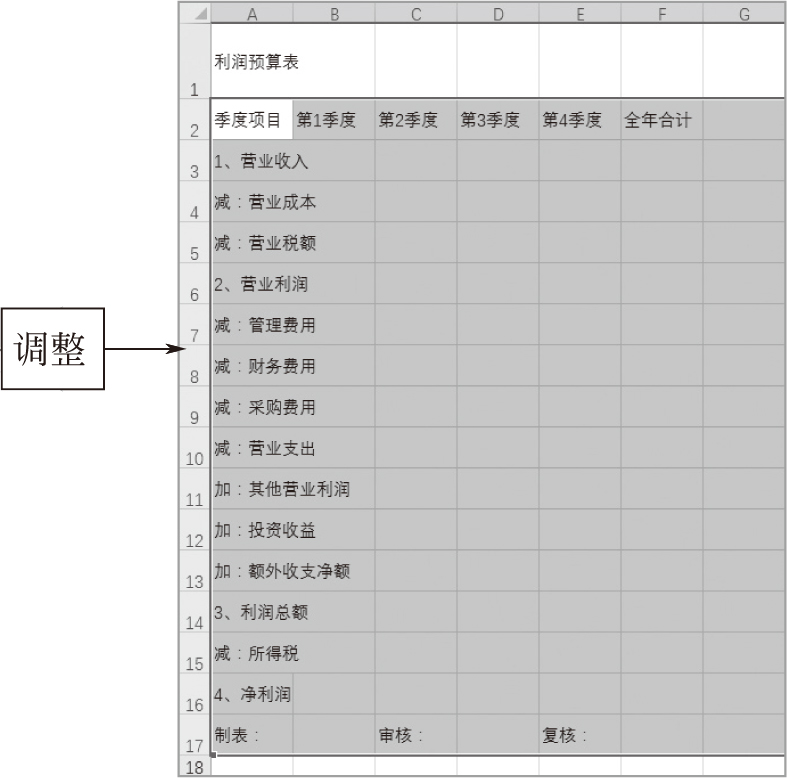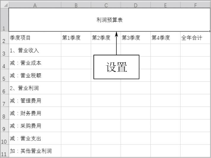 在创建的工作表中输入利润预算表的表单内容后,即可对工作表进行格式设置,包括调整工作表的行高、列宽,设置字体、字号、对齐方式以及添加边框线等。下面介绍具体的操作方法。