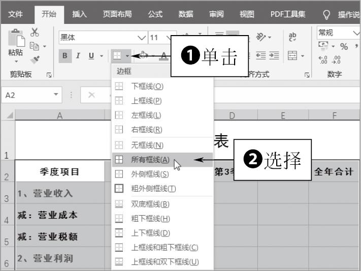 执行操作后,即可为所选单元格区域添加边框线,❶选择A2单元格;❷在“开始”功能区的“对齐方式”面板中单击“左对齐”按钮