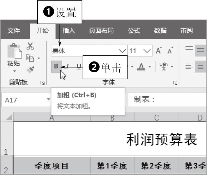 在“开始”功能区的“字体”面板中,❶设置“字体”为“黑体”;❷单击“加粗”按钮