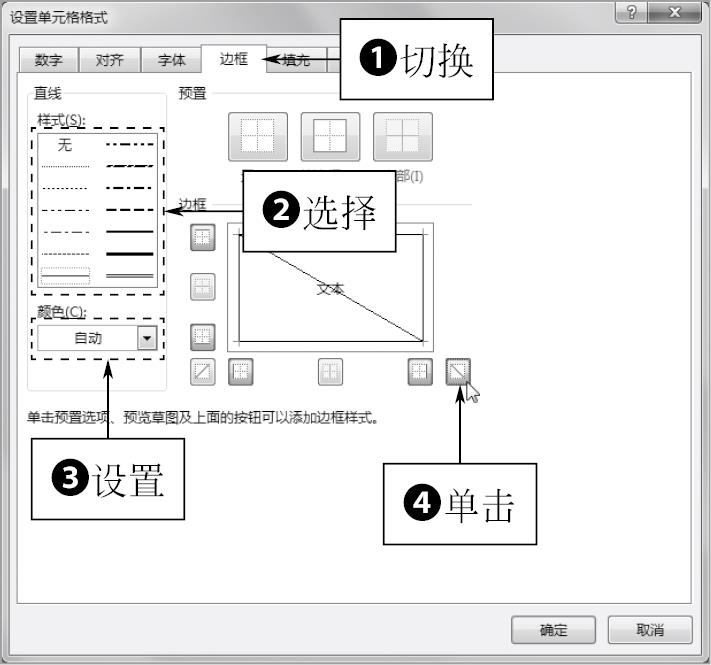 按【Ctrl+1】组合键,弹出“设置单元格格式”对话框,❶切换至“边框”选项卡;❷在“样式”选项区中可以选择线条样式;❸在“颜色”选项区中可以为线条设置颜色;❹在“边框”选项区中的文本预览草图下方单击最后一个按钮