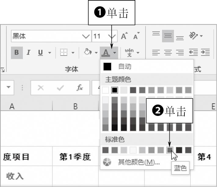 在“开始”功能区的“字体”面板中,❶单击“字体颜色”下拉按钮
