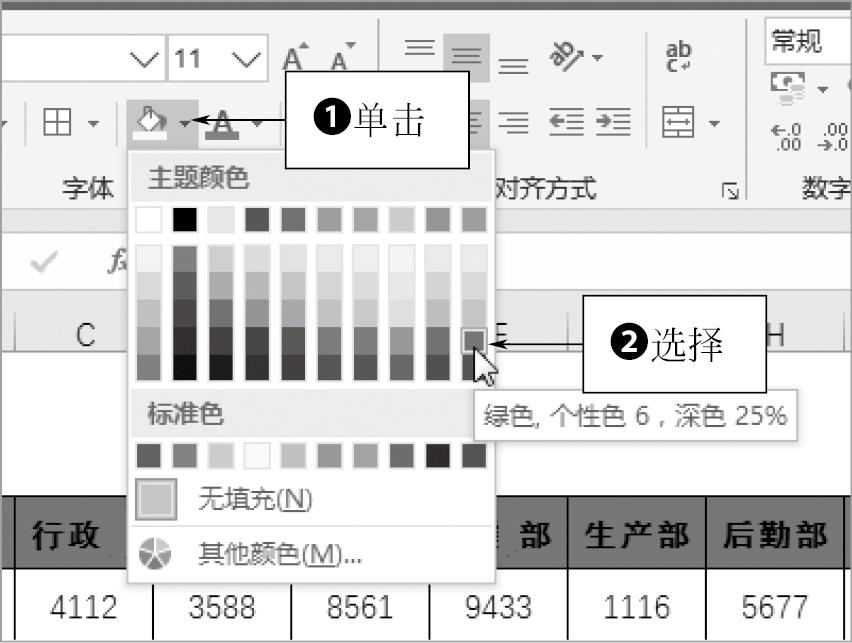 图2-7 选择“绿色,个性色6,深色25%”色块