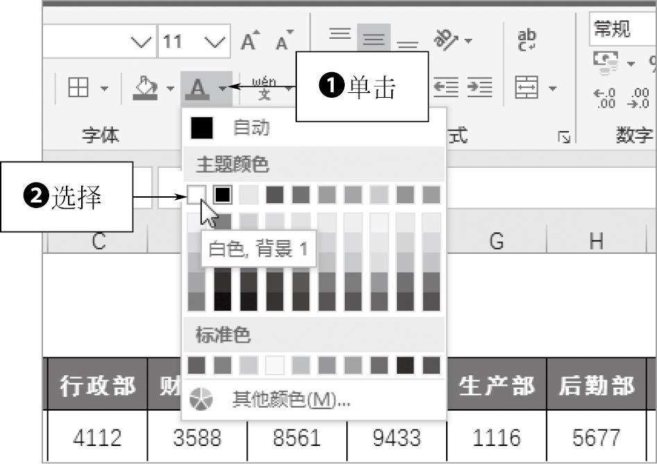 STEP 07 执行操作后,❶单击“字体颜色”下拉按钮 ;❷在弹出的色板中选择“白色,背景1”色块,如图2-8所示。