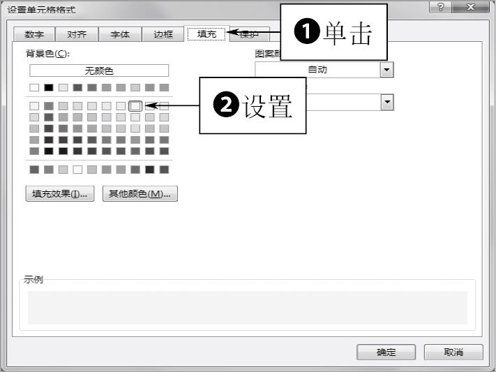 STEP 15 ❶单击“填充”标签,切换至“填充”选项卡;❷设置单元格区域的填充颜色(颜色可参考计算机屏幕,下同),如图1-20所示。