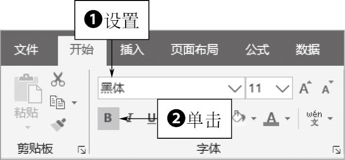 选择A2:F2单元格区域,在“开始”功能区的“字体”面板中,❶设置“字体”为“黑体”;❷单击“加粗”按钮