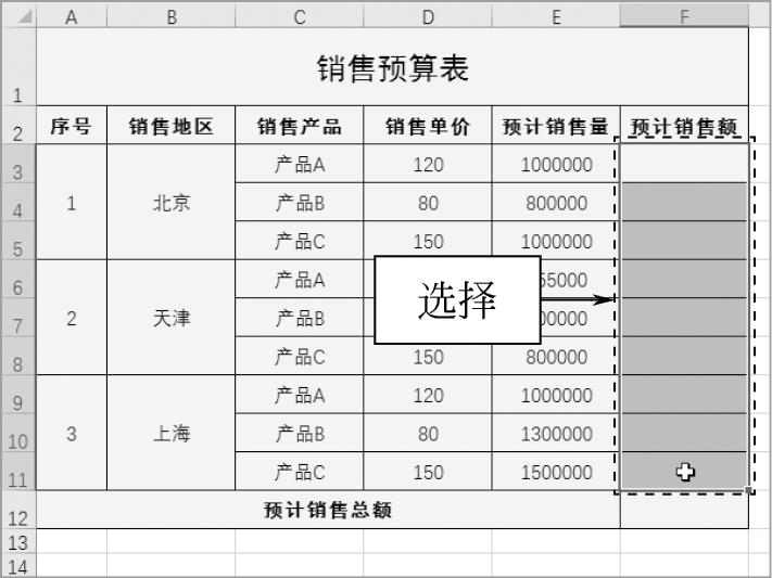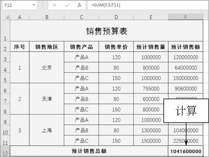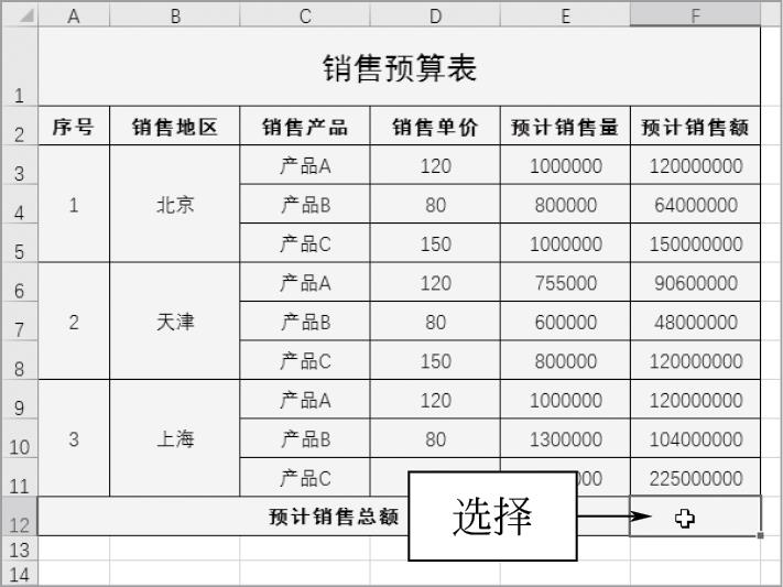 接下来需要统计预计的销售收入金额,其计算公式为:销售单价×预计销售量=预计销售额。下面介绍使用该公式和SUM函数公式统计销售预算的操作方法。