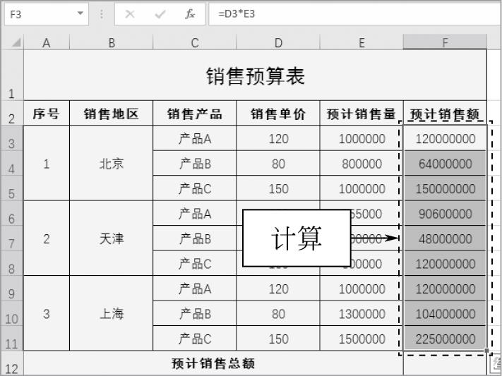 STEP 03 按【Ctrl+Enter】组合键确认,即可批量计算出预计销售额,效果如图1-24所示。