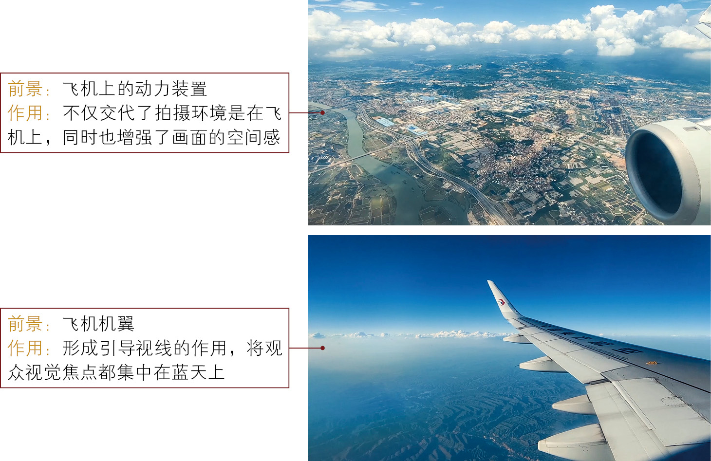 图2-13所示为使用前景构图航拍的视频,选取飞机的机翼和动力装置作为前景,提高了画面的整体视觉冲击力。