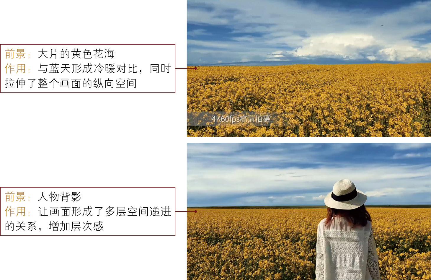 所谓前景,最简单的解释就是位于视频拍摄主体与镜头之间的事物。前景构图是指利用恰当的前景元素来构图取景,可以使视频画面具有更强烈的纵深感和层次感,同时也能极大地丰富视频画面的内容,使视频更加鲜活饱满。因此,在进行视频拍摄时,可以将身边能够充当前景的事物拍摄到视频画面中来。