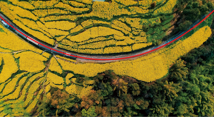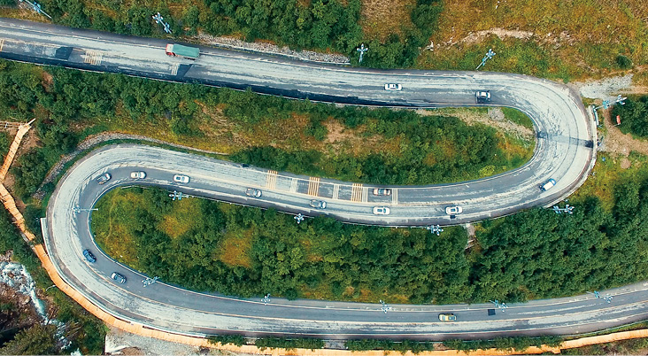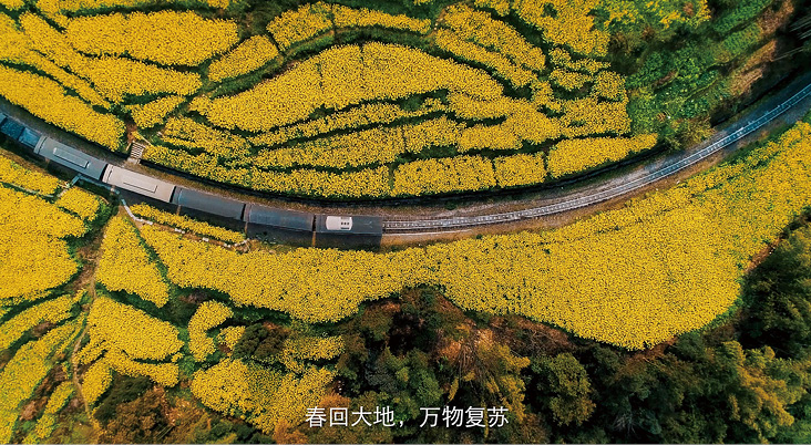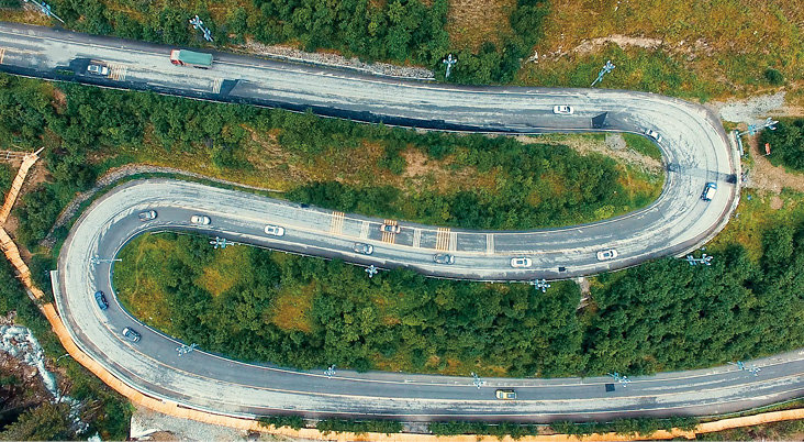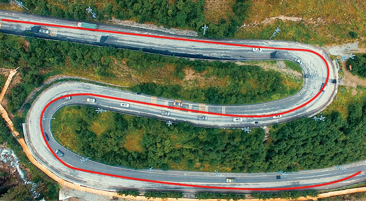 (3)曲线构图:线条弯曲而圆润,适合表现自身富有曲线美的景物,可以很好地表达被摄对象的韵律,且具有魅力的形态。图2-32所示为采用“升镜头+曲线构图”方式拍摄的铁轨短视频,让画面更具流动感。图2-33所示为使用无人机拍摄的山路短视频,通过“远景+近景”呈现出山路的S形曲线,使画面更具韵律感。