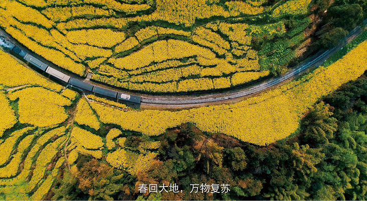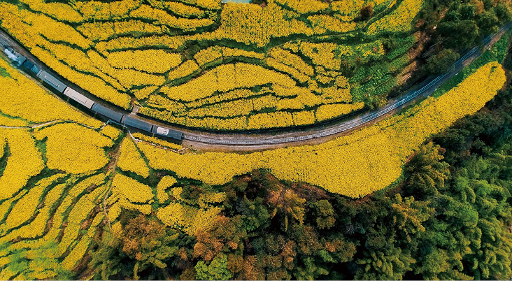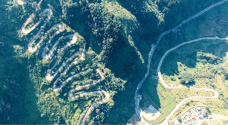 (3)曲线构图:线条弯曲而圆润,适合表现自身富有曲线美的景物,可以很好地表达被摄对象的韵律,且具有魅力的形态。图2-32所示为采用“升镜头+曲线构图”方式拍摄的铁轨短视频,让画面更具流动感。图2-33所示为使用无人机拍摄的山路短视频,通过“远景+近景”呈现出山路的S形曲线,使画面更具韵律感。