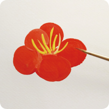 选朱红色水粉颜料勾勒一下花瓣外轮廓,让外形更清晰。