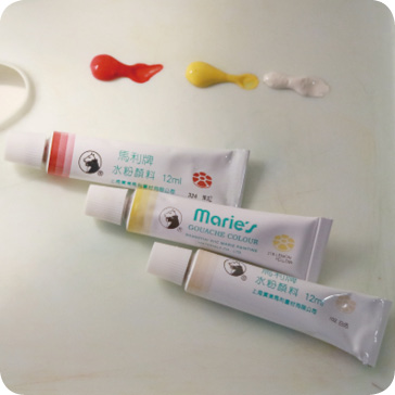 选用朱红色、柠檬黄色和白色水粉颜料。