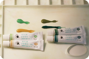 选用淡绿色、土黄色、橄榄绿色和深绿色水粉颜料。