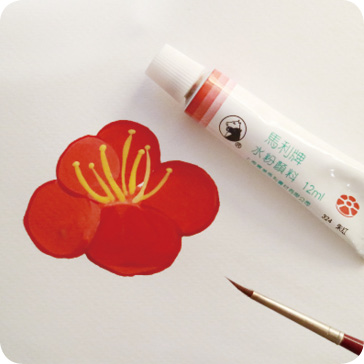 选朱红色水粉颜料勾勒一下花瓣外轮廓,让外形更清晰。