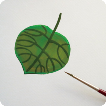 橄榄绿色加一点点深绿色,选最细的画笔,可以选用水彩画笔,运用勾线法勾画叶脉和外轮廓,线条要流畅。