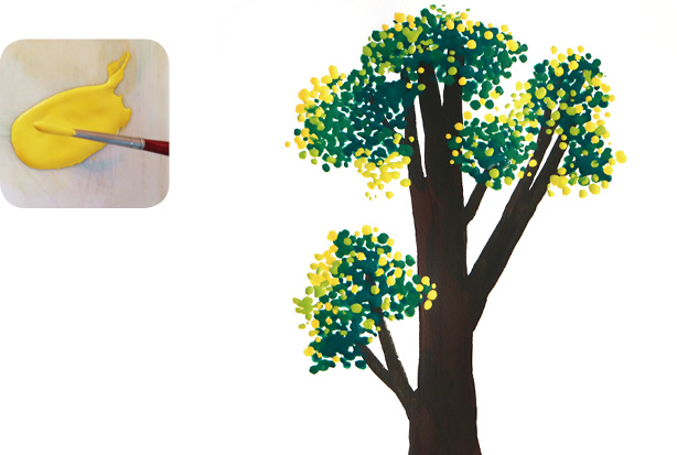 画大树,准备柠檬黄色、草绿色、翠绿色和熟褐色水粉颜料,选3号、1号和一根极细的水彩勾线笔用来点彩。