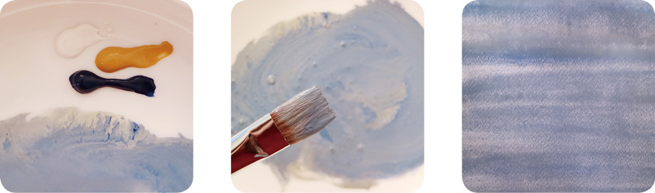 趁着画纸半湿状态,用群青色混合土黄色和白色,选择7号水粉画笔沿一个方向画背景。