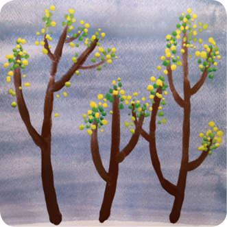 选择1号水粉画笔或最细的水彩画笔,用柠檬黄色和草绿色点出树叶。