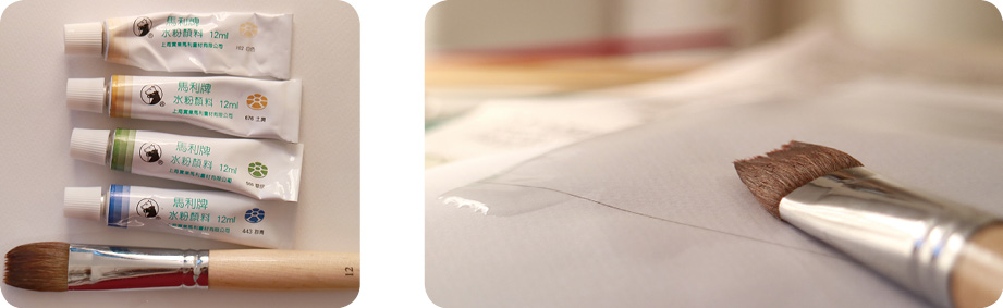 白色、土黄色、草绿色和群青色,12号水粉画笔,运用湿画法营造湿润的背景效果。先在所画区域涂一层清水。