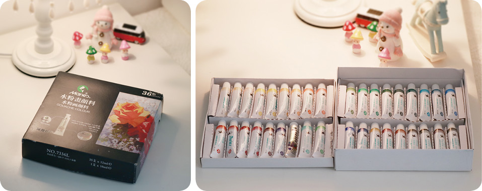 管装马利36色水粉画颜料,以及打开后的样子