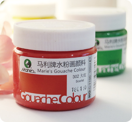水粉画颜料的优点很多,比如覆盖力较强,稳定性高,色彩丰富,有利于展示绘画技法,非常适合绘画初学者使用。水粉画颜料也有一些小缺点,比如颜色刚涂好时很鲜艳,等到干透后或多或少都会变得有些暗淡,这是颜料特性决定的。我们可以通过色彩搭配、绘画技法和时间的把控来解决这个问题,具体内容后面会讲到。