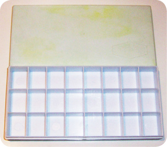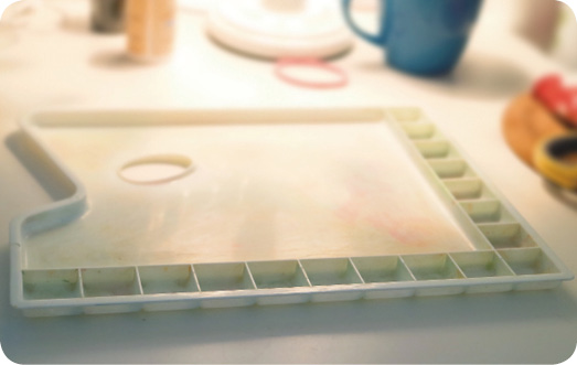 准备一个调色盘或颜料盒,调色盘的形状长方形或椭圆形均可,颜料盒因为在使用时一般是将水粉画颜料按照色系逐一挤在颜料盒的格子里,更有利于熟悉颜料的名称,了解色系的排列顺序。