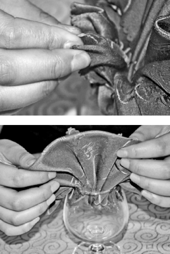 ⑥将餐巾放入杯中,捏出头部,整理成型。
