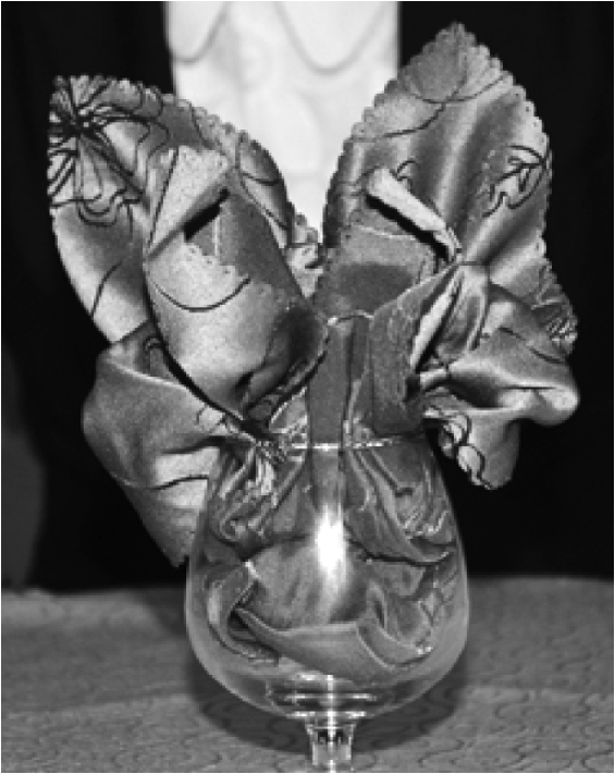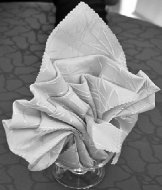杯花折叠的技法复杂,程序较多,具体的折叠方法有折、叠、穿、卷、翻、拉、捏、掰、推等。下面选取20种杯花折叠方法进行介绍。