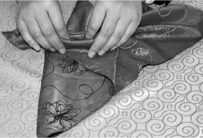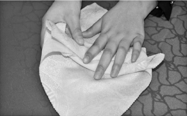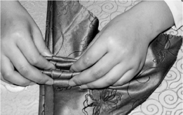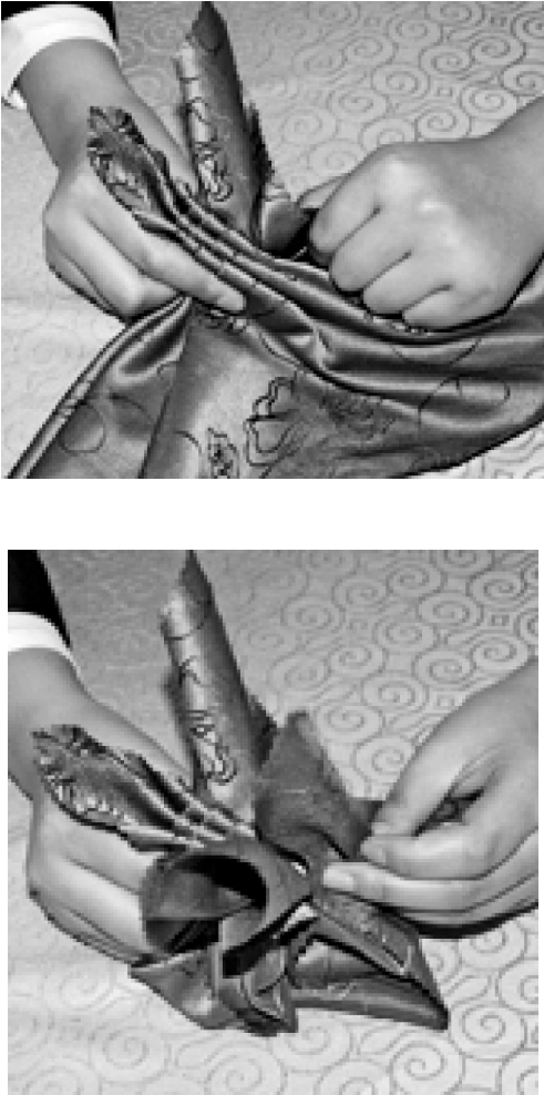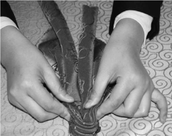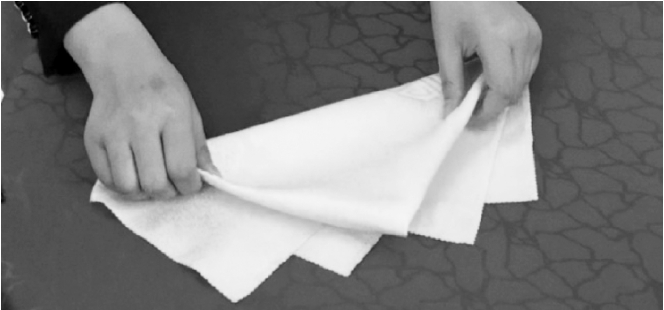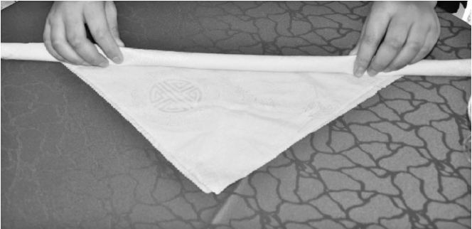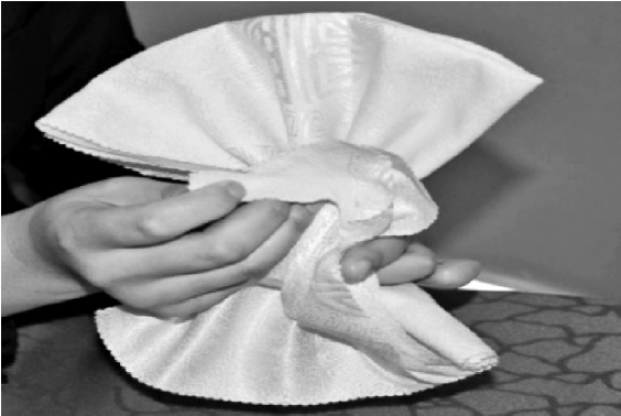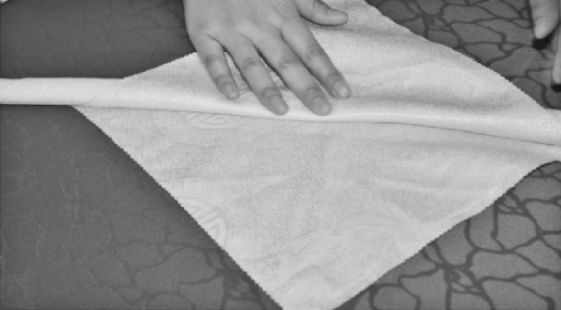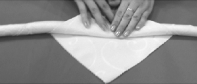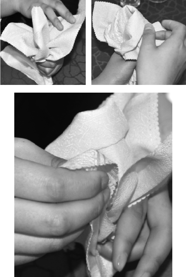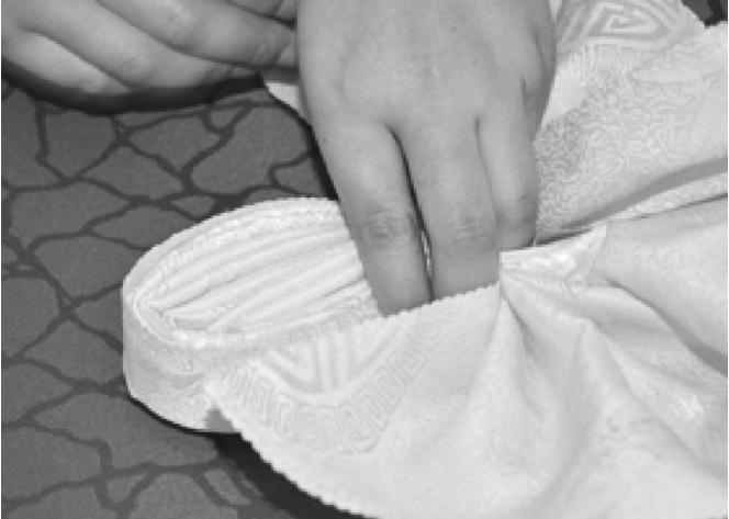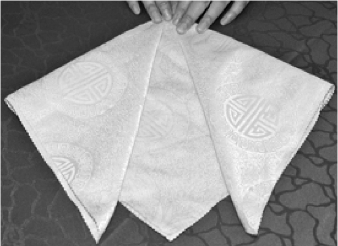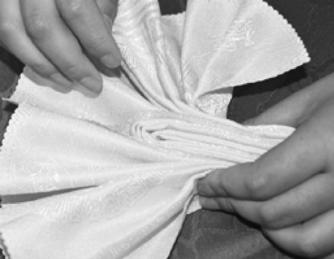 ③从餐巾的两层边向对边捏褶。