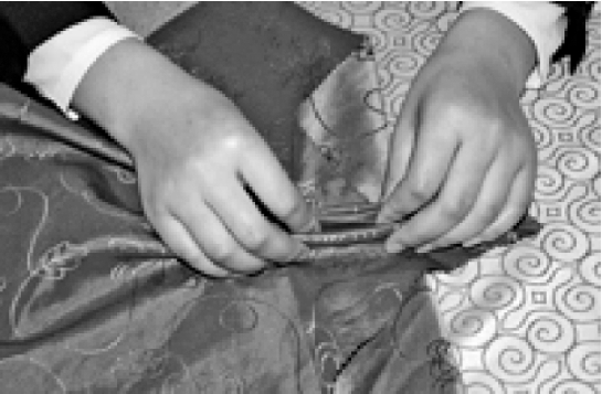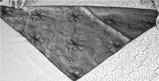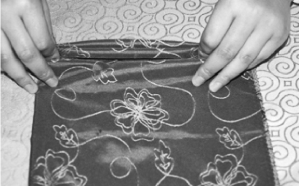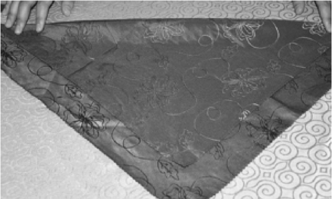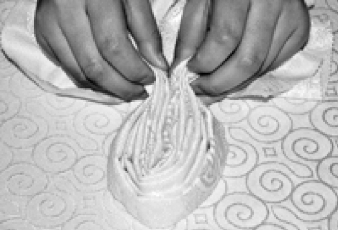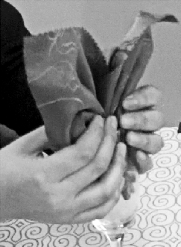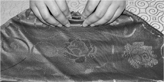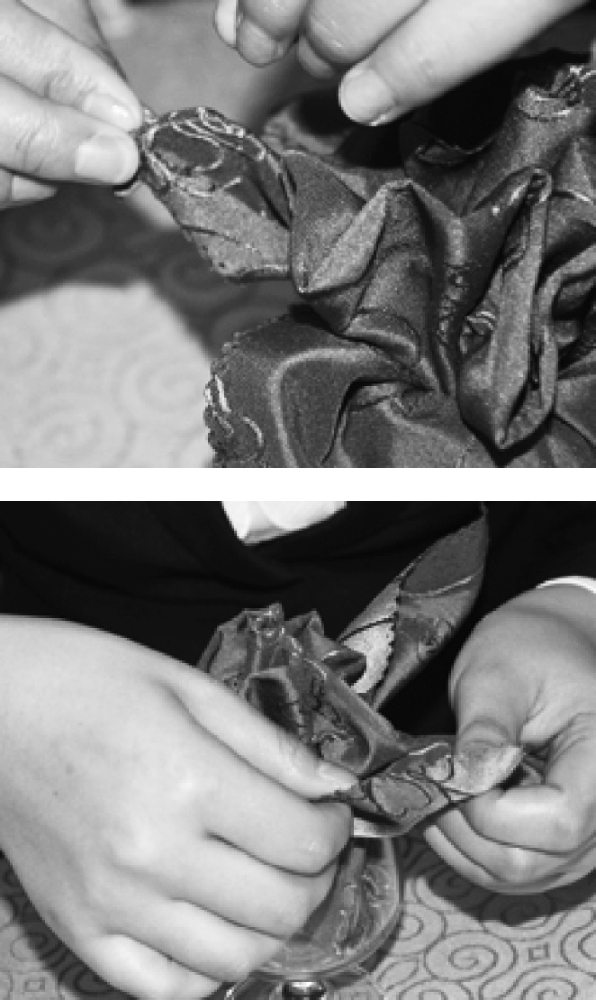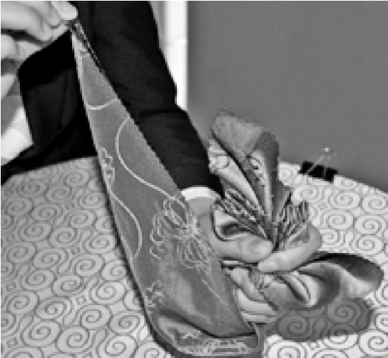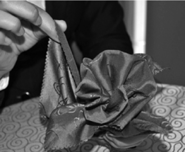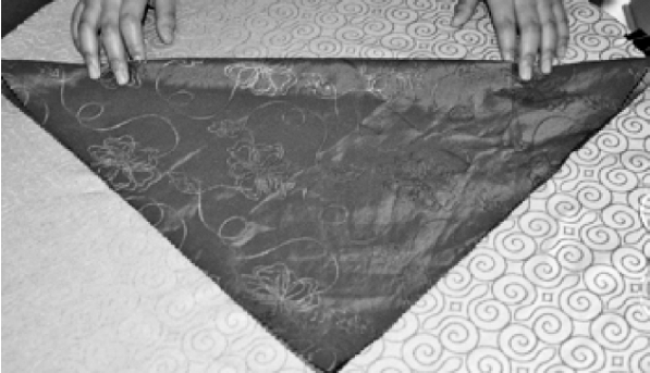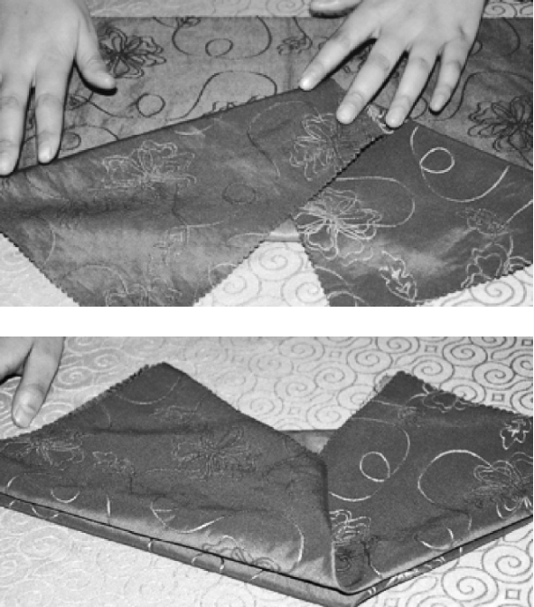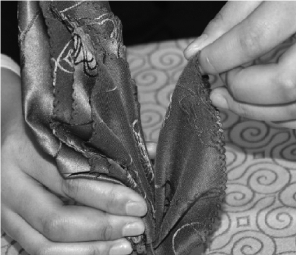 ③从餐巾的两层边向对边捏褶。