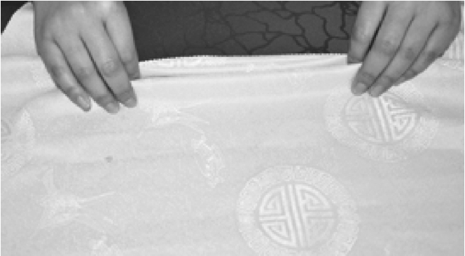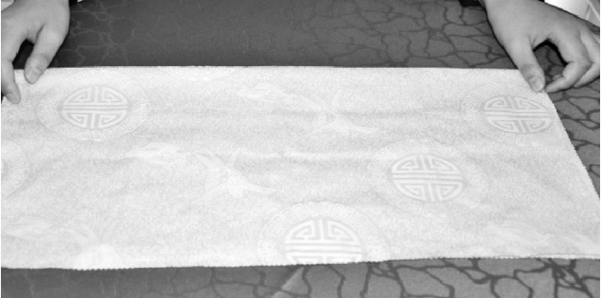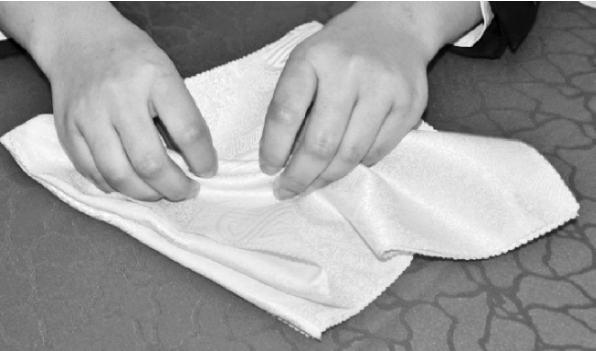 ②整理餐巾折裥,双手捏住距餐巾两端约为20cm处。