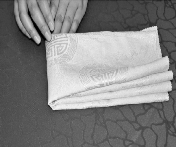 ④将餐巾旋转90°,从餐巾一短边向对边捏褶。