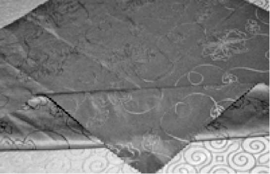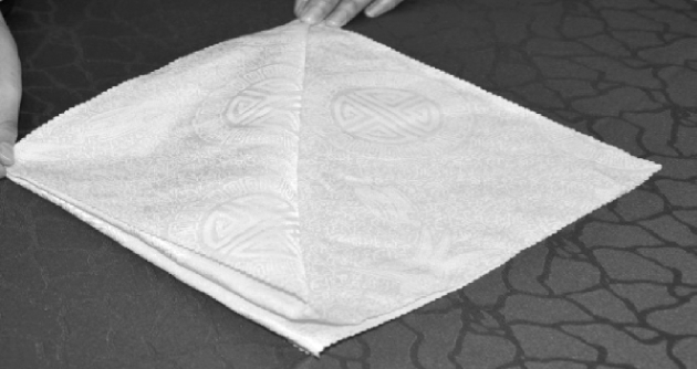 ②将两层餐巾中的上层的两个巾角向对边翻折。