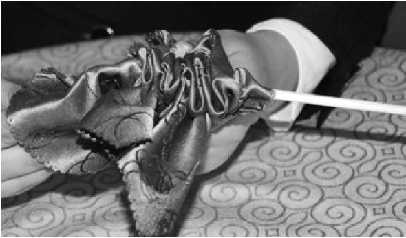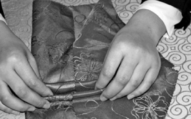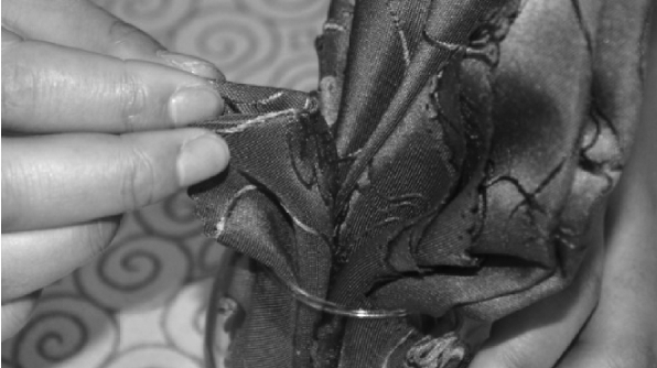 ④将筷子的细头插入折裥内,并挤紧。