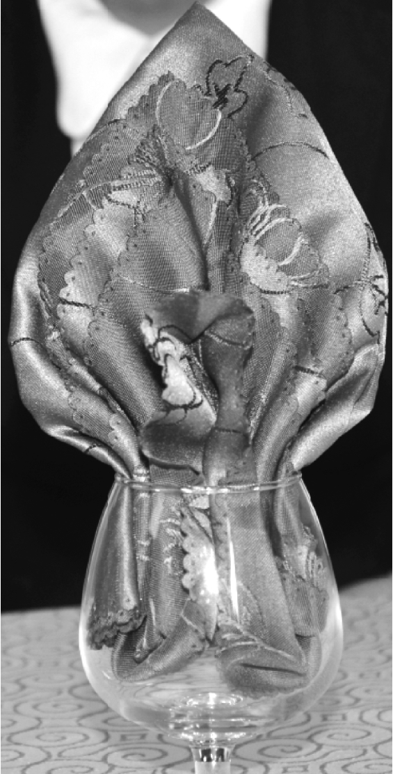 ⑤将餐巾放入杯中,捏出头部,整理成型。