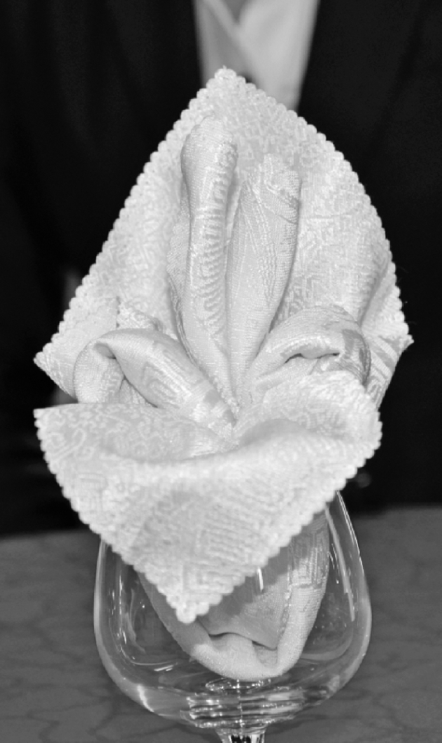 ④捏住餐巾中间位置,将餐巾四个角向上翻,并固定到餐巾中间位置。