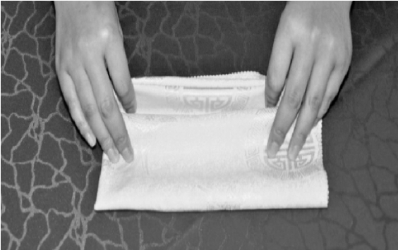 ③握住距对折点约为7cm处,作为折点,将两侧的餐巾分别沿折点对折。