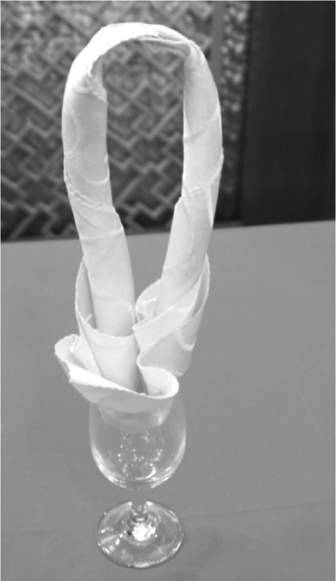 ⑤将餐巾放入杯中,并将餐巾一端插入另一端,整理成型。