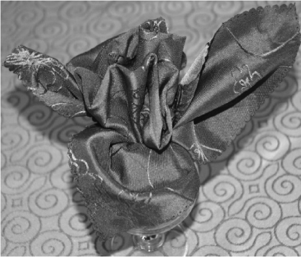⑥握住餐巾,放入杯中,整理花芯、花瓣成型。
