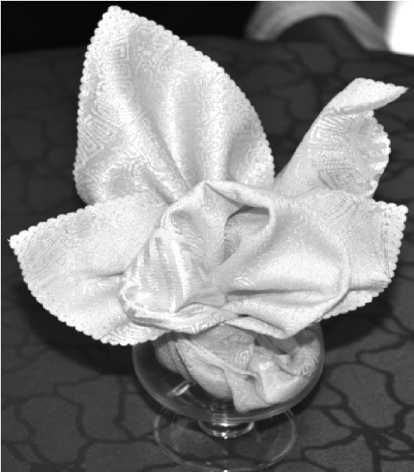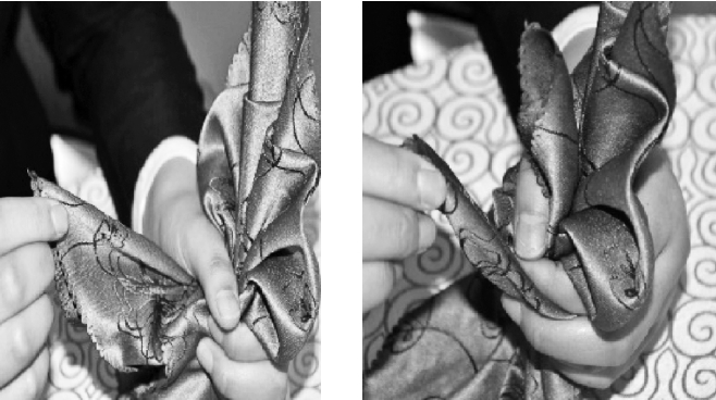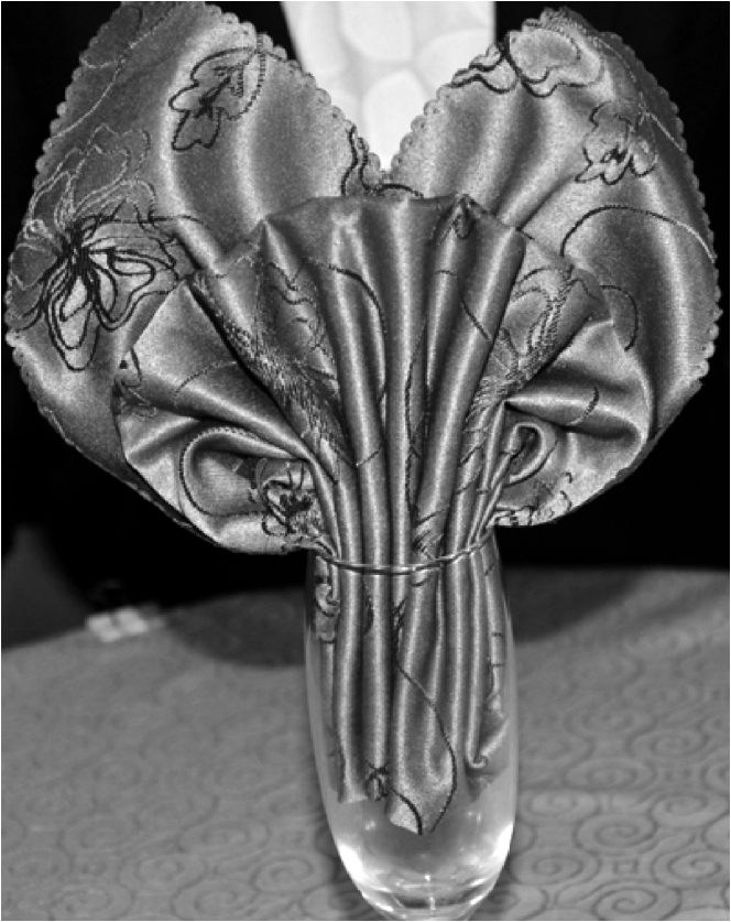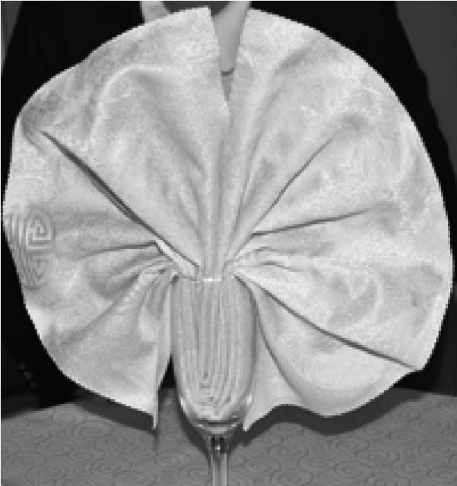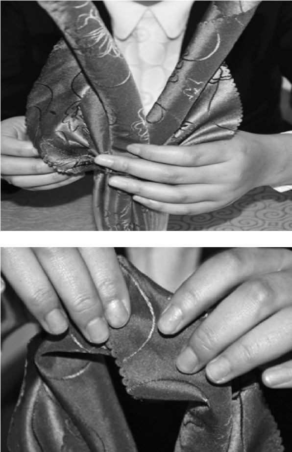 杯花折叠的技法复杂,程序较多,具体的折叠方法有折、叠、穿、卷、翻、拉、捏、掰、推等。下面选取20种杯花折叠方法进行介绍。