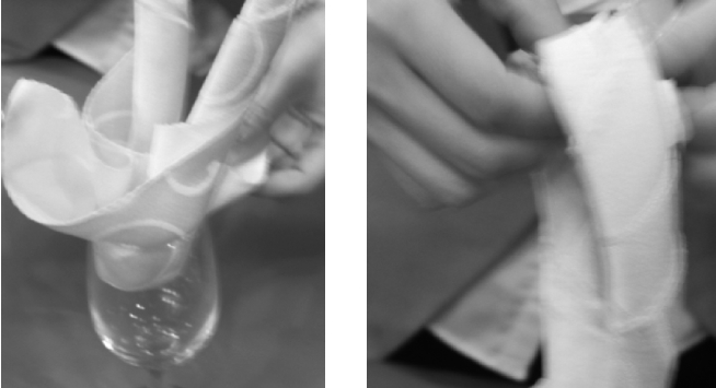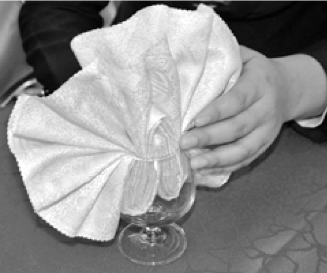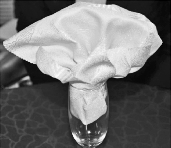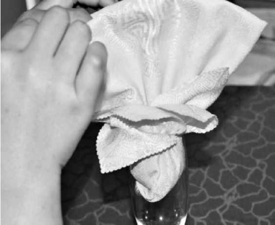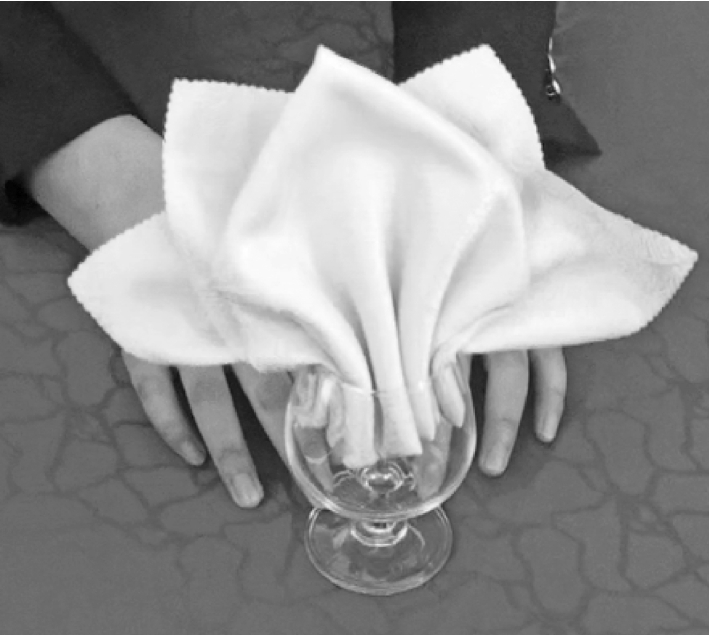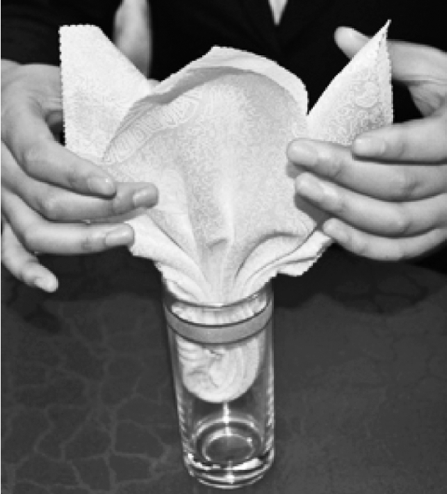 ⑤将餐巾放入杯中,捏出头部,整理成型。