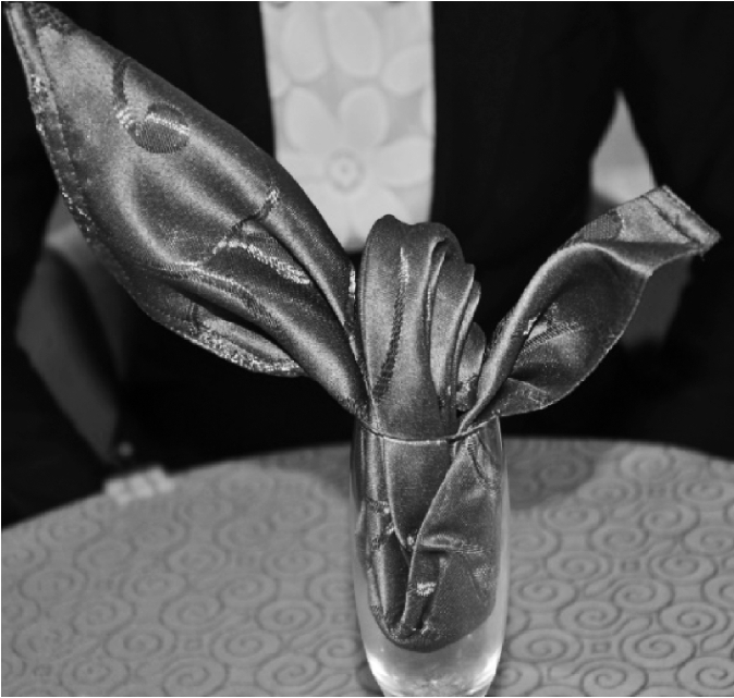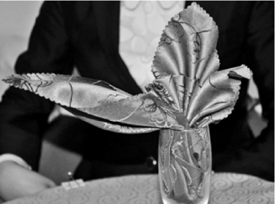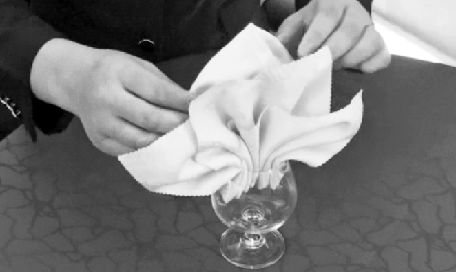⑤将餐巾放入杯中,并将餐巾一端插入另一端,整理成型。
