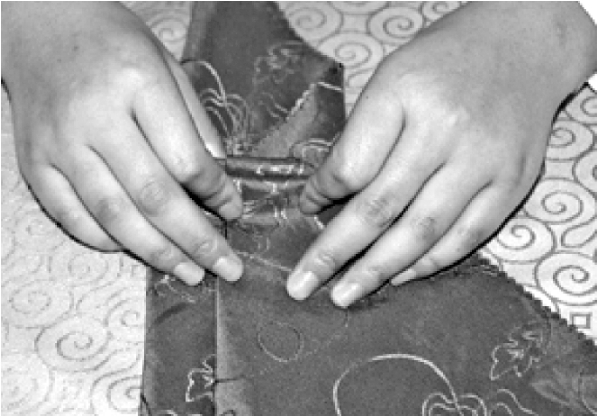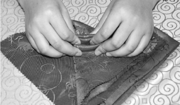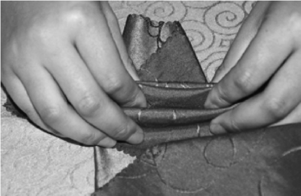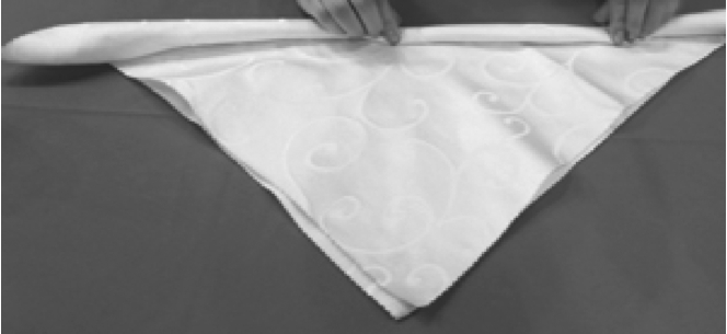 ④将餐巾旋转90°,从餐巾一短边向对边捏褶。