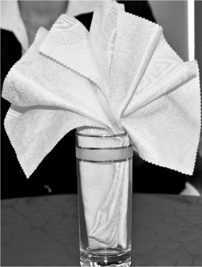 ⑤把餐巾放入杯中,将一个尖端插入另一个尖端里,整理成型。